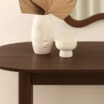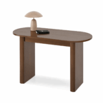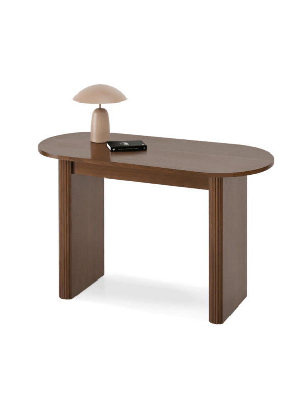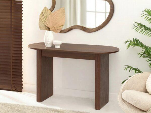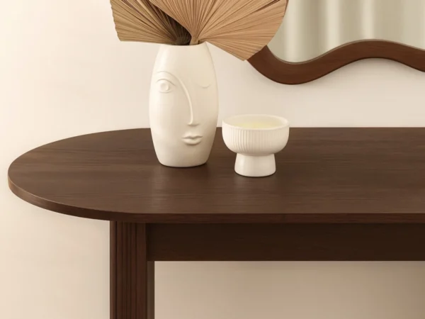 Konzolna mizica Artisana z ovalno površino velikosti 120 cm ponuja veliko uporabnega prostora, idealnega za dekoracije, svetilke ali potrebščine. Zahvaljujoč stabilnemu furniranemu podstavku je ta kos trpežen in vzdržljiv, kar zagotavlja leta brezskrbne uporabe. Njegova vsestranska zasnova omogoča uporabo v različnih prostorih, lahka zasnova pa olajša premikanje.