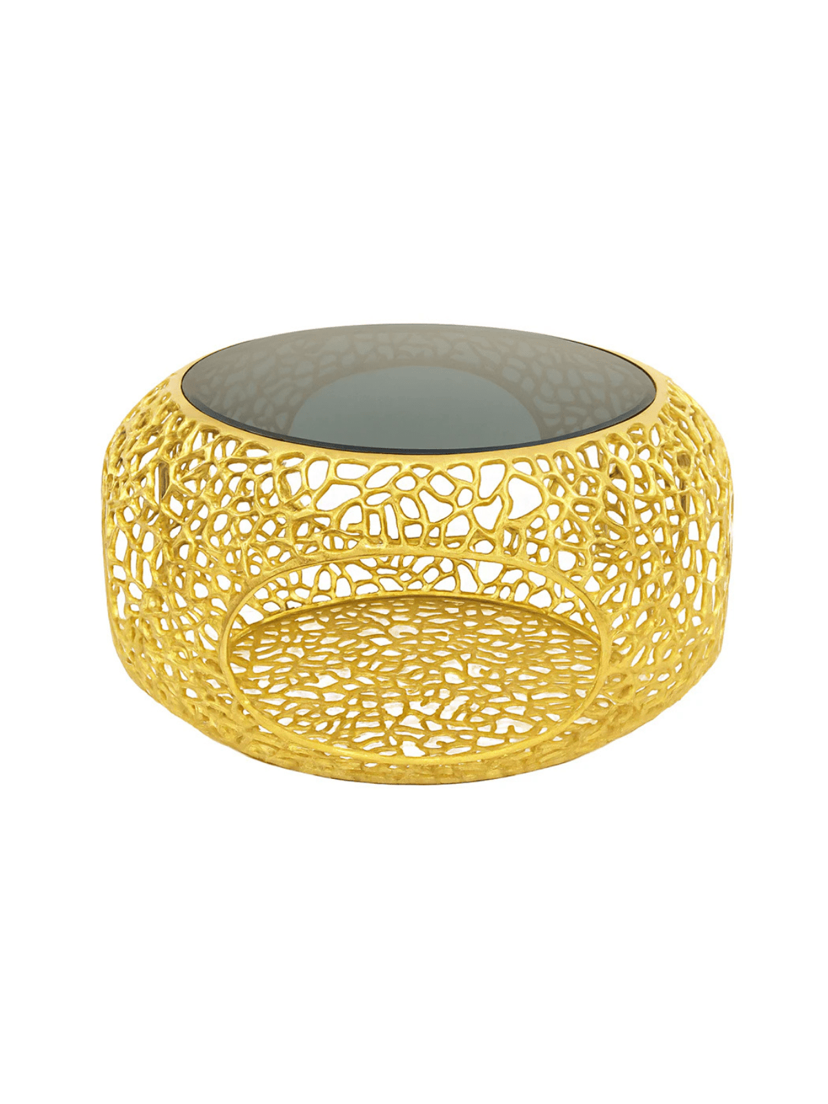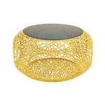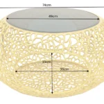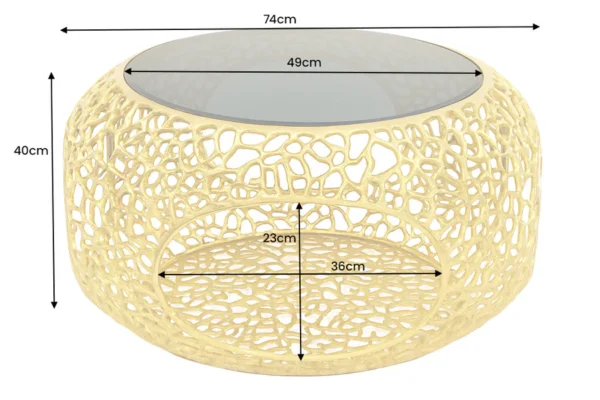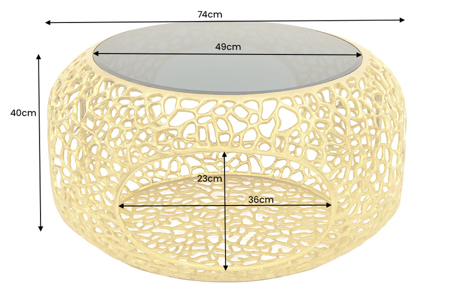 Klubska mizica Noura združuje elegantno črno kaljeno steklo z drzno zlato kovinsko podlago za prefinjen videz. Zasnovana je za izboljšanje sodobnih bivalnih prostorov in združuje vizualni učinek s trpežno izdelavo ter brezčasno eleganco.