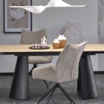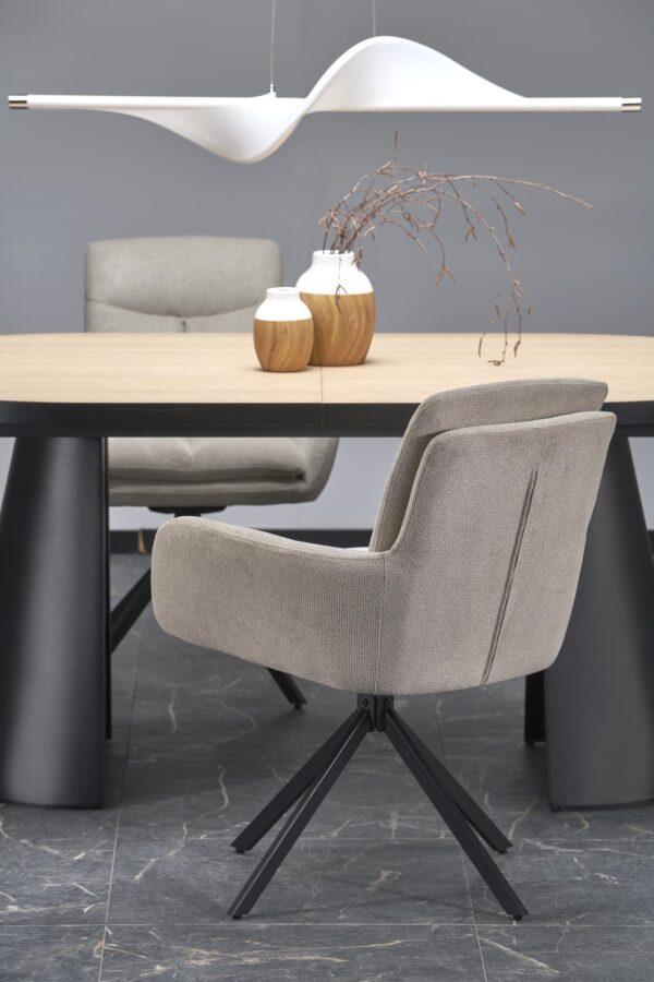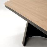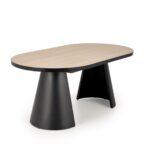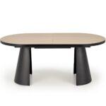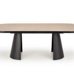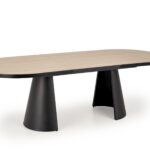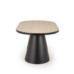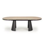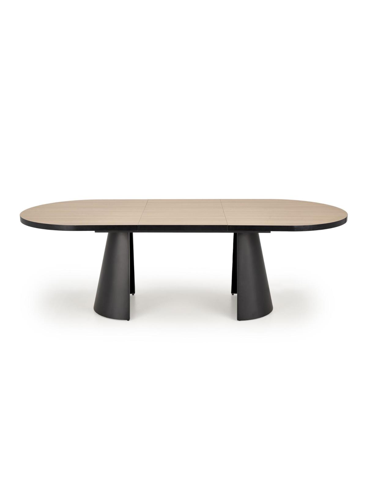Črna stožčasta kovinska noga mize Grian 180 daje mizi moderen in dizajnerski videz. Mizna plošča je izdelana iz melaminizirane MDF plošče v naravni barvi svetlega lesa s črnim robom. Dimenzija mize je 180(240) x 100 cm.