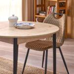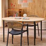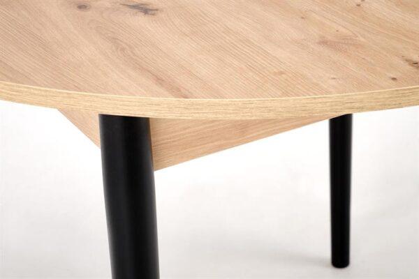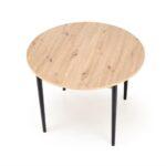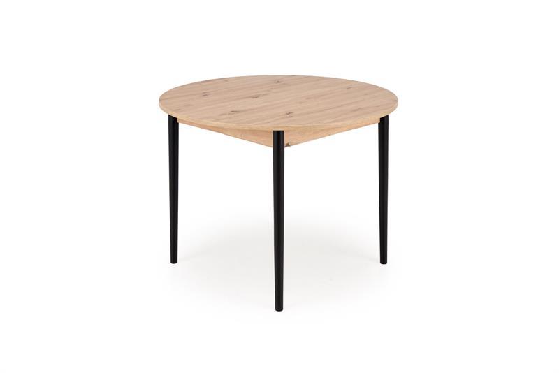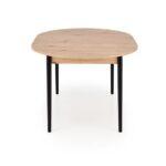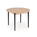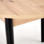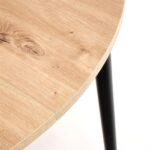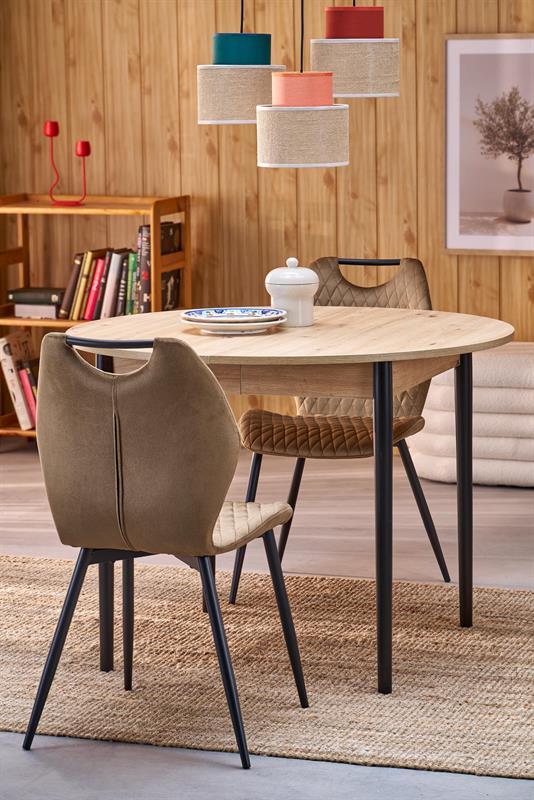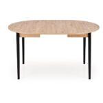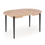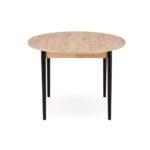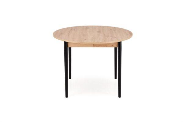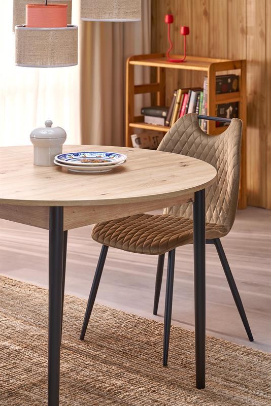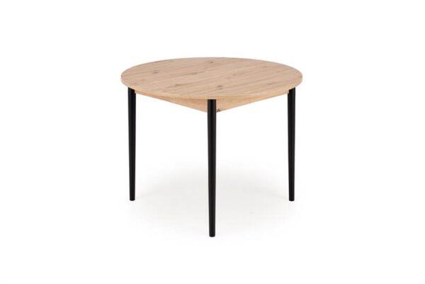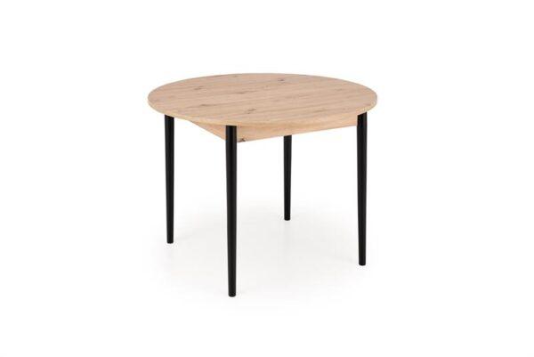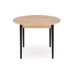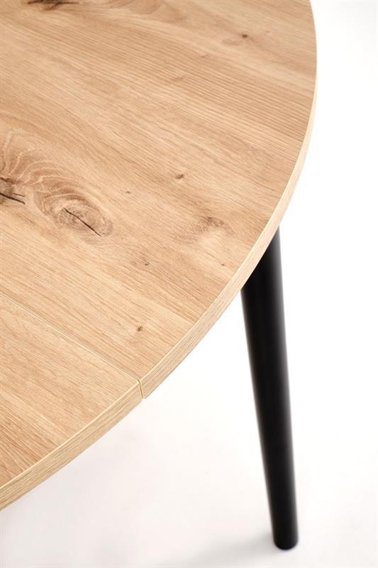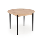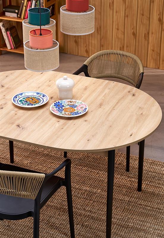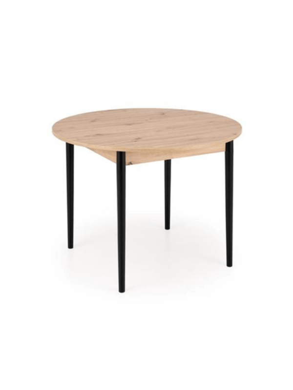 Jedilna miza Karol je elegantna raztegljiva miza, ki združuje funkcionalnost z modernim dizajnom. Njena plošča je izdelana iz laminirane pohištvene plošče v umetniškem odtenku hrasta, kar ji daje topel, naraven videz, ki spominja na klasični les. Noge mize v kontrastni temno črni barvi poudarjajo sodoben značaj kosa. Vrtljiva miza se odlično prilega tako manjšim prostorom kot večjim jedilnicam, zahvaljujoč raztegljivi funkciji, ki omogoča prilagajanje velikosti mize številu gostov.