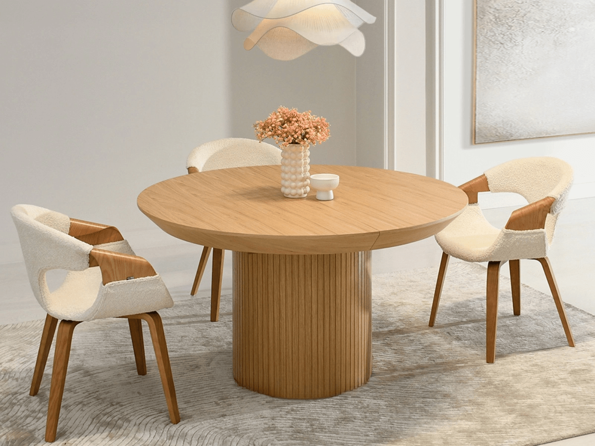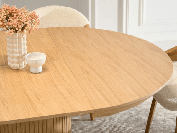 Minimalistična, a dekorativna zasnova jedilne mize Matteo poudarja njen sodoben značaj in daje notranjosti harmonijo. Ta model se popolnoma prilega notranjosti s skandinavskim navdihom, vendar bo svoje mesto našel tudi v bolj tradicionalnem okolju. Zgornja plošča je izdelana iz furniranih plošč v barvi hrasta, ki združuje naravni učinek lesa in vzdržljivost. Furnir odlično odraža strukturo lesa in mu daje pristen, topel značaj. Zanimiv videz mizne plošče v obliki prisekanega valja optično tanjša obliko mize in vnaša zanimiv element.