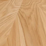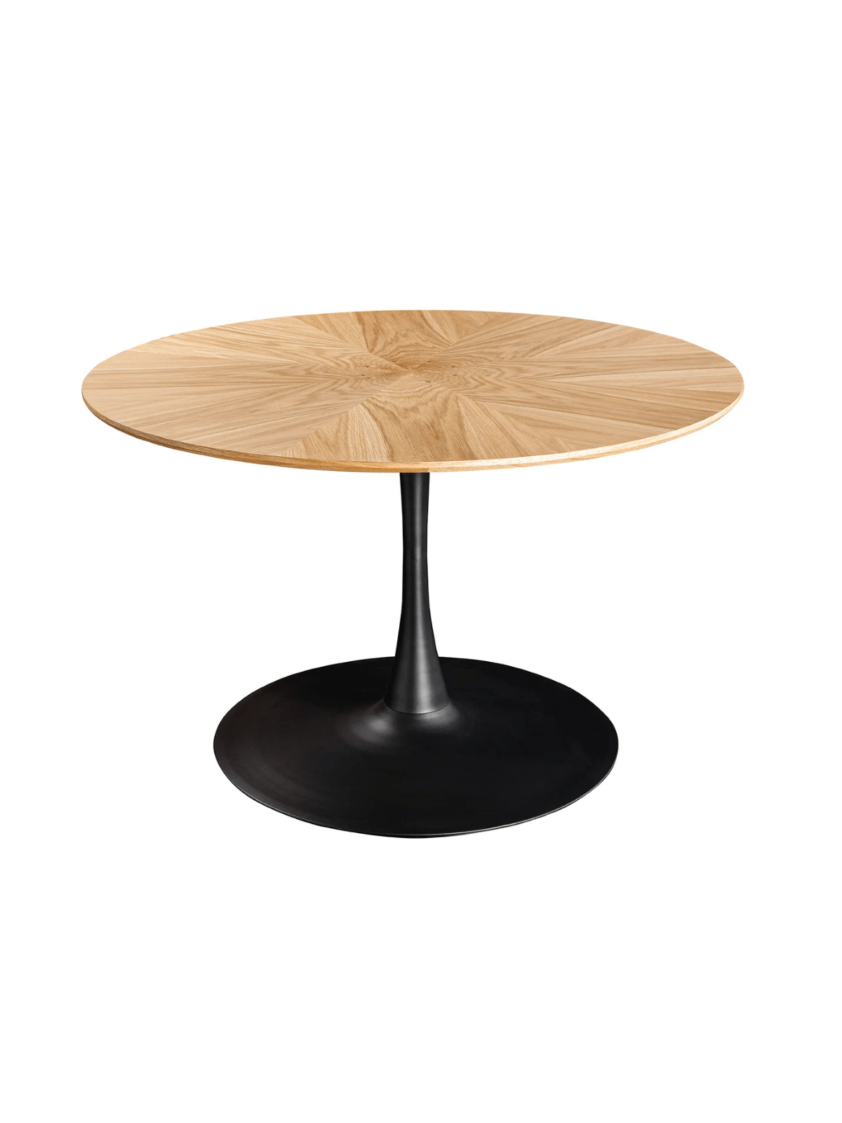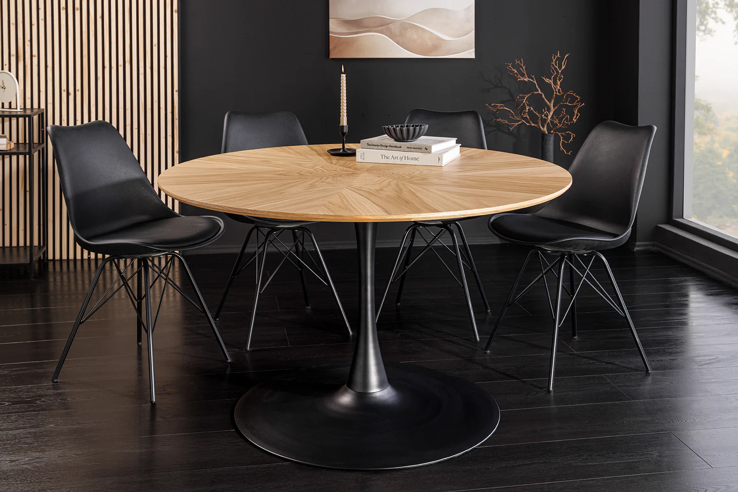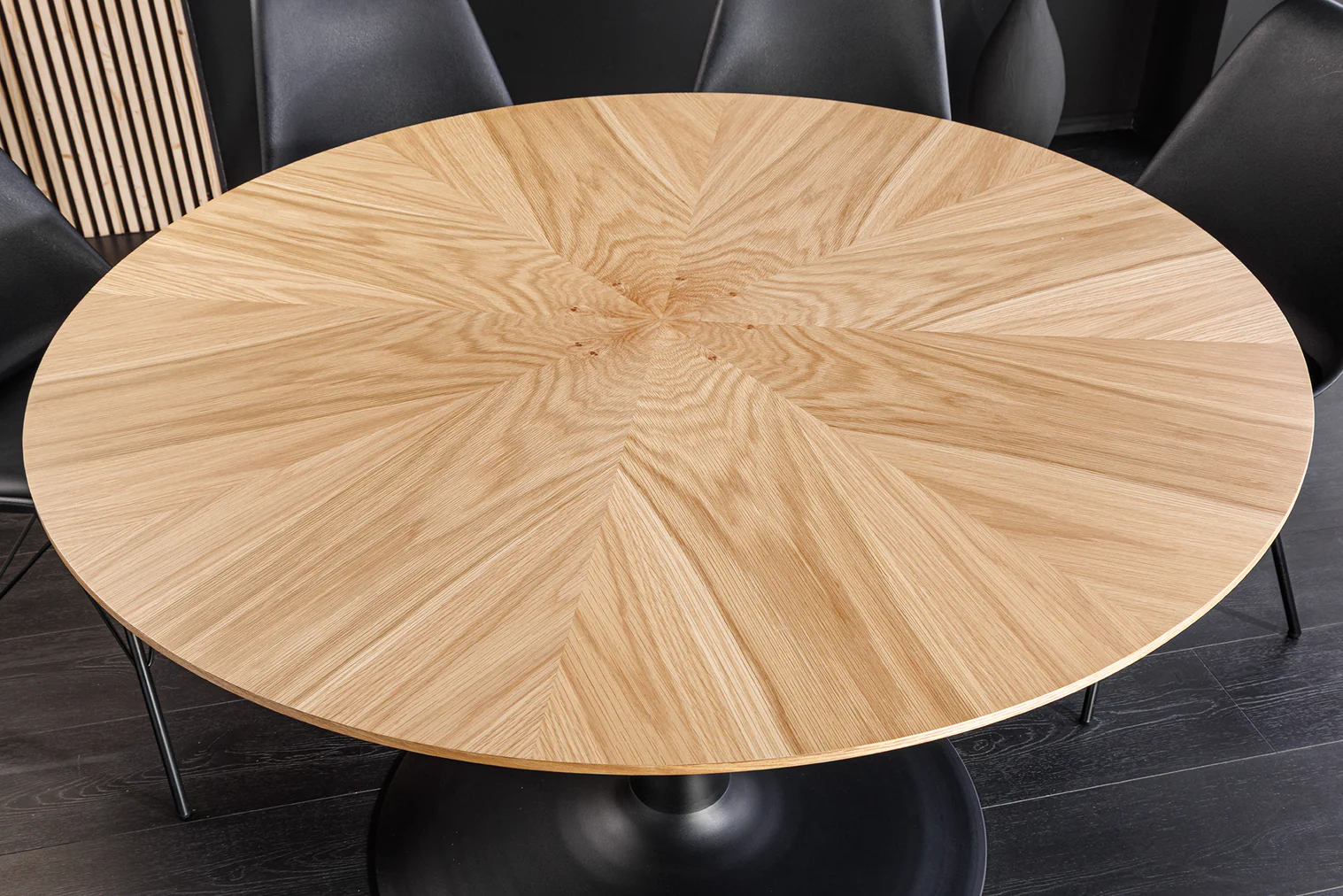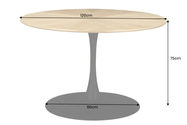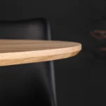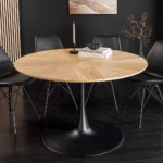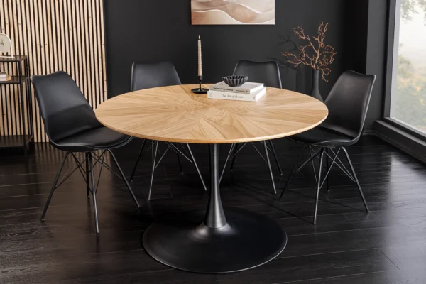 Okrogla jedilna miza Nairi združuje topel hrastov furnir z elegantnim kovinskim podnožjem, zaradi česar je vsak obrok poseben.