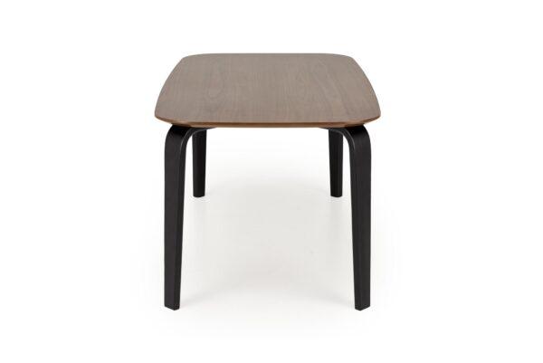 Jedilna miza Tucco ima ploščo z zaobljenimi robovi iz najkvalitetnejše MDF plošče z naravnim orehovim furnirjem ter valjane črne noge iz masivnega kavčukovca.