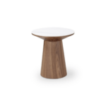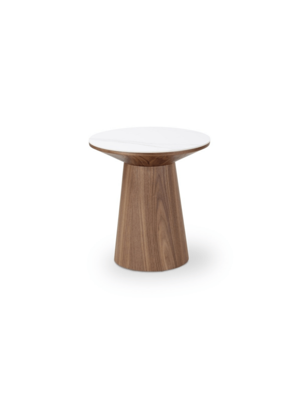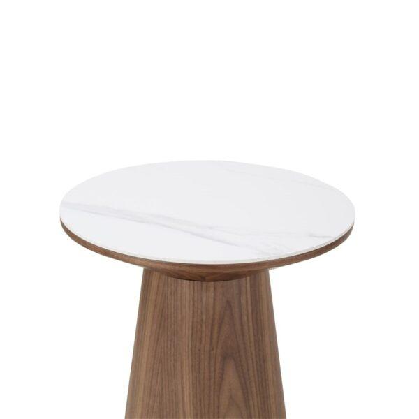 Klubska mizica Clarice združuje naravno toplino s prefinjeno eleganco. Plošča iz belega sintranega kamna ji doda trpežen in proti praskam odporen zaključek, idealen za vsakdanje življenje.