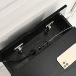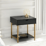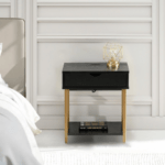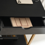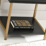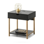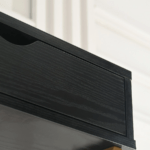 Črna nočna mizica Mikey je eleganten model izdelan iz visokokakovostne laminirane plošče. Njegova površina izstopa s subtilnim vzorcem lesnih zrn, ki ji daje naraven in moderen videz. Trdna konstrukcija zagotavlja dolgo življenjsko dobo in odpornost na vsakodnevno uporabo.