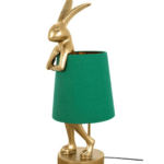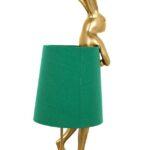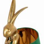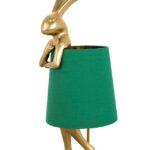 Namizna svetilka Rabbit ima edinstven dizajn v obliki sramežljivega zajčka, prevlečenega z zelenim lanenim senčnikom. Figurica je izdelana z veliko pozornostjo do detajlov iz poliresina, prašno prevlečenega z zlatom. Ta dekorativna, avantgardna svetilka, ki pritegne pozornost, se bo odlično podala v sodobno notranjost.