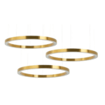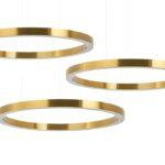 Obesek Ring I je kombinacija modernih in elegantnih svetilk Ring, ki jih lahko po želji razporedite na eno stropno vrtnico. Obročaste svetilke so narejene iz zlatega nerjavečega jekla in akrilnih pokrovov svetlobnega vira. Obešen v kaskadi na kovinskih kablih bo Ring zagotavljal optimalno osvetlitev in izjemen vizualni vtis.
