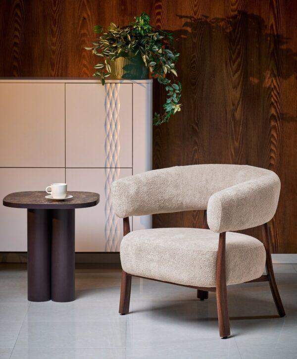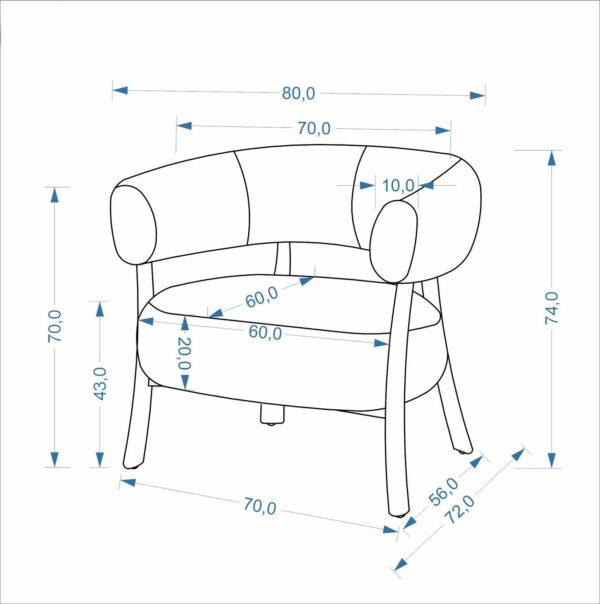 Sodoben fotelj s sodobnim dizajnom odlikujejo zaobljene linije in bogato oblazinjen sedež, ki zagotavlja visoko raven udobja. Oblazinjen je v kakovostno tkanino, ki prispeva k prijetnemu in elegantnemu videzu. Idealna izbira za dnevno sobo ali prostor za sprostitev.