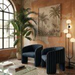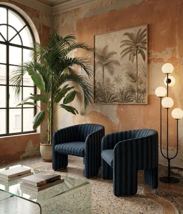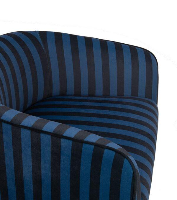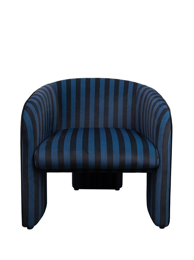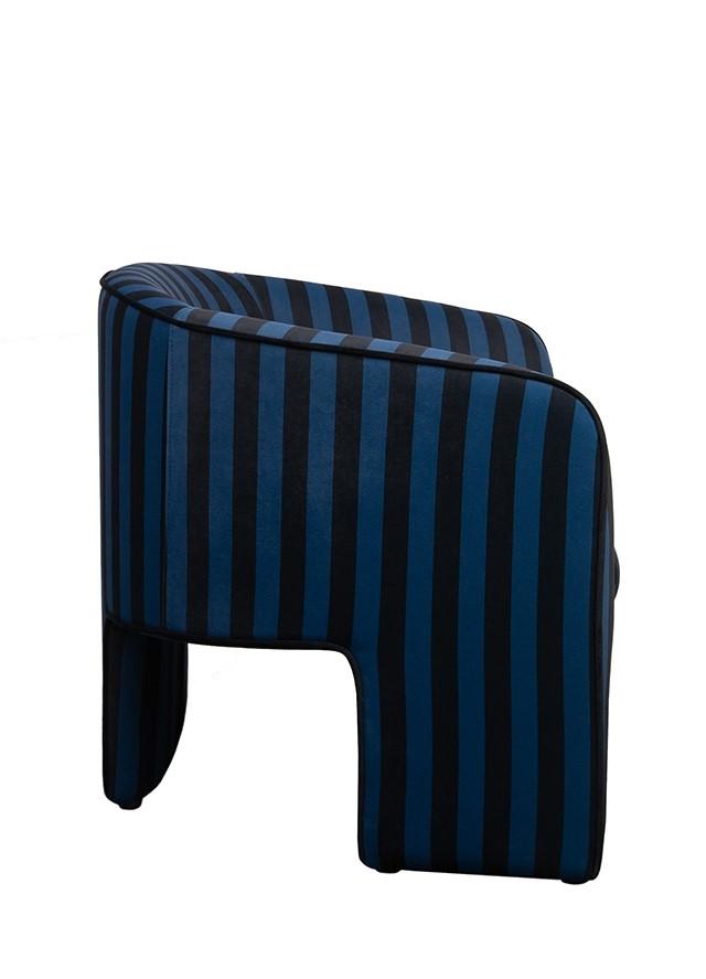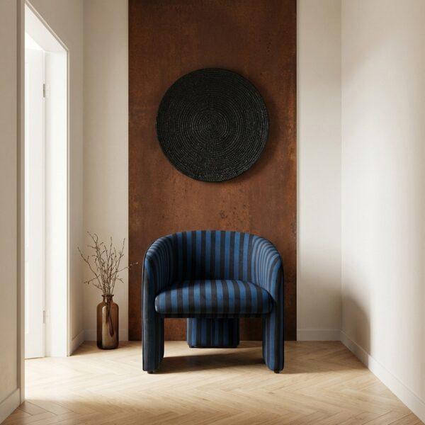 Fotelj Tambo navdušuje s svojim značilnim črtastim vzorcem, ki mu daje dizajnerski značaj. Mehko žametno oblazinjenje subtilno odbija svetlobo in poudarja globino barv, zaobljena oblika naslonjala pa ustvarja prijetno, obdajajočo silhueto, ki spodbuja sprostitev.