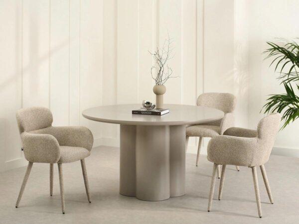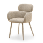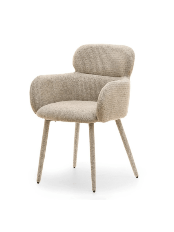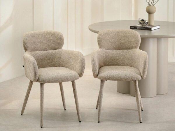 Jedilni stol Aveiro ni le estetsko privlačen, temveč ponuja tudi najvišjo raven ergonomije in udobja – zasnovan je za vsakodnevno uporabo, saj zagotavlja oporo in sprostitev. Uporaba visokokakovostne, gosto tkane tkanine v odtenkih bež melanža zagotavlja vzdržljivost in enostavno vzdrževanje. Sedež je oblazinjen z mehko peno, podstavek iz kovine, prevlečen s tkanino v istem odtenku, pa združuje trdnost s harmoničnim videzom.