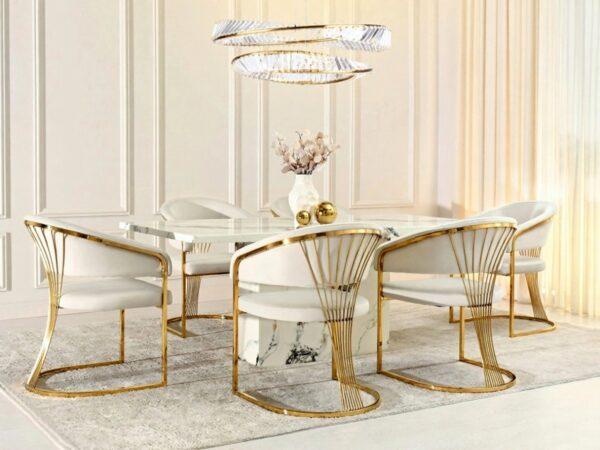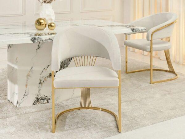 Jedilni stol Diesel III je eleganten in sodoben model, ki bo videti popoln tako v dnevni sobi kot v jedilnici. Kombinacija mehkega, lahkega oblazinjenja in bleščečega zlatega podnožja vnese pridih razkošja in prefinjenosti v vsako notranjost. Ergonomska oblika in udobno naslonjalo stola zagotavljata udobje med dolgimi obroki ali pogovori z najdražjimi.