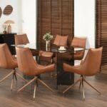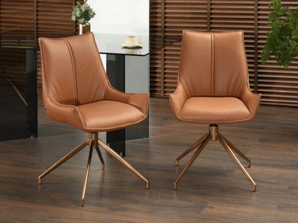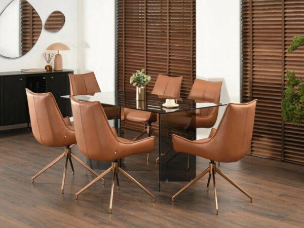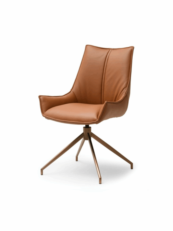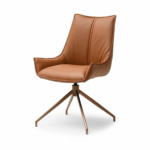 Jedilni stol Furio je sodoben, dizajnerski model, idealen za vsakodnevno uporabo in elegantne prostore. Oblazinjen je v visokokakovostno pravo usnje v topli rjavi barvi in okrašen z nežnimi šivi, zato združuje izjemno udobje z estetiko.