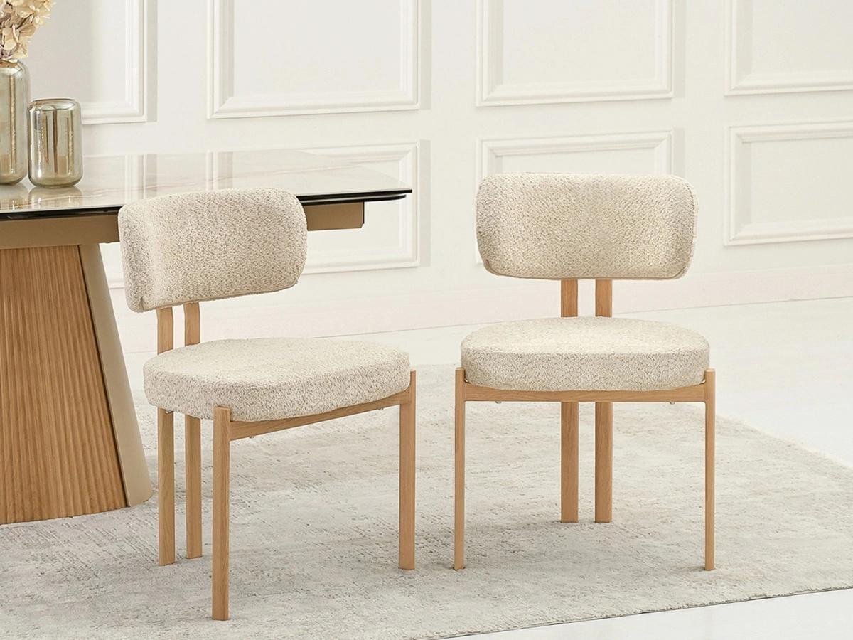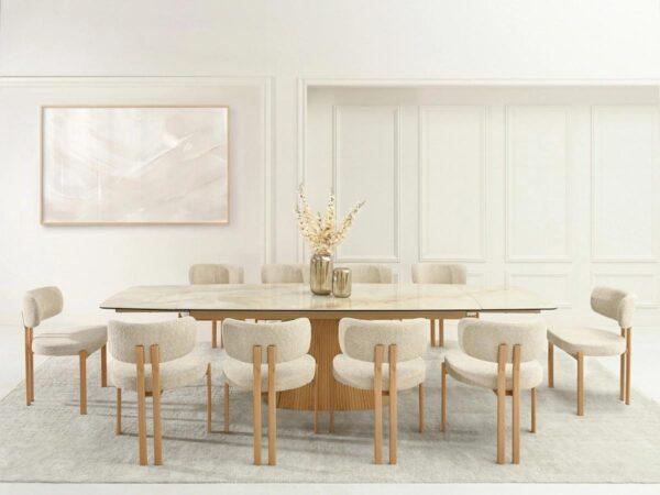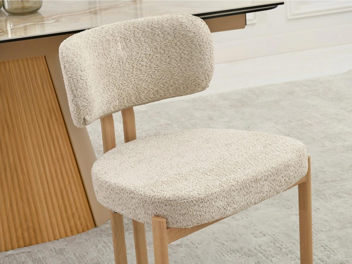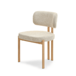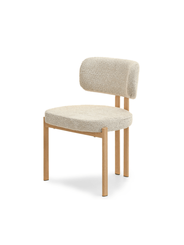 Jedilniški stol Grevena odlikuje pravilna geometrijska oblika z dvema navpičnicama, ki se raztezata od oblazinjenega naslonjala v noge. Oblazinjenje stola z značilno zankasto buclé strukturo daje modelu edinstven, eleganten videz, hkrati pa v notranjost vnaša sodoben, teksturiran poudarek.