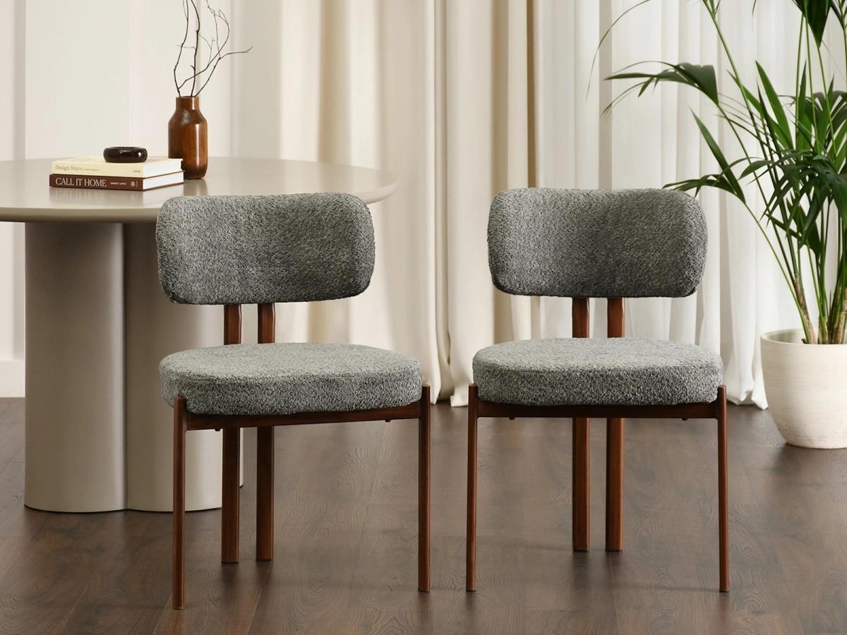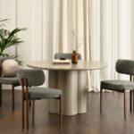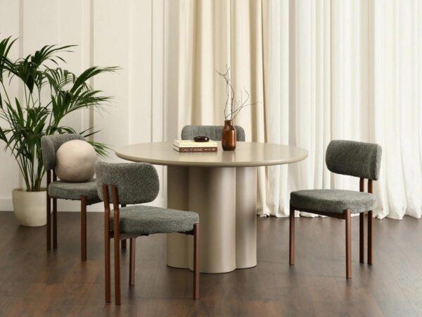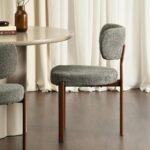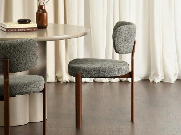 Jedilni stol Grevena odlikuje pravilna geometrijska oblika z dvema navpičnicama, ki se raztezata od oblazinjenega naslonjala do podnožja. Oblazinjenje stola z značilno zankasto buclé strukturo daje modelu edinstven, eleganten videz, hkrati pa v notranjost vnaša sodoben teksturni poudarek.
