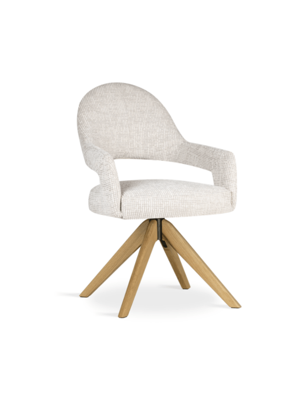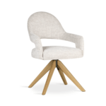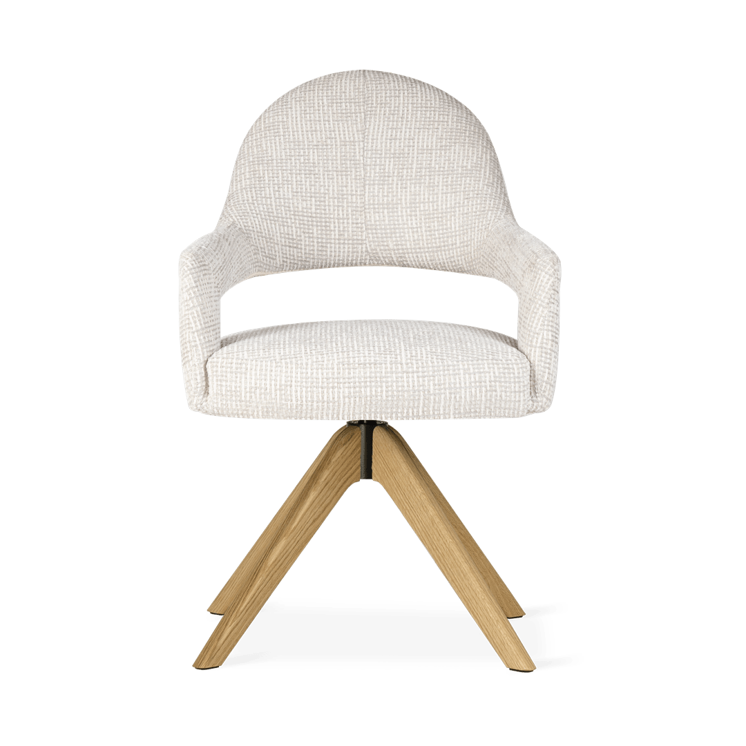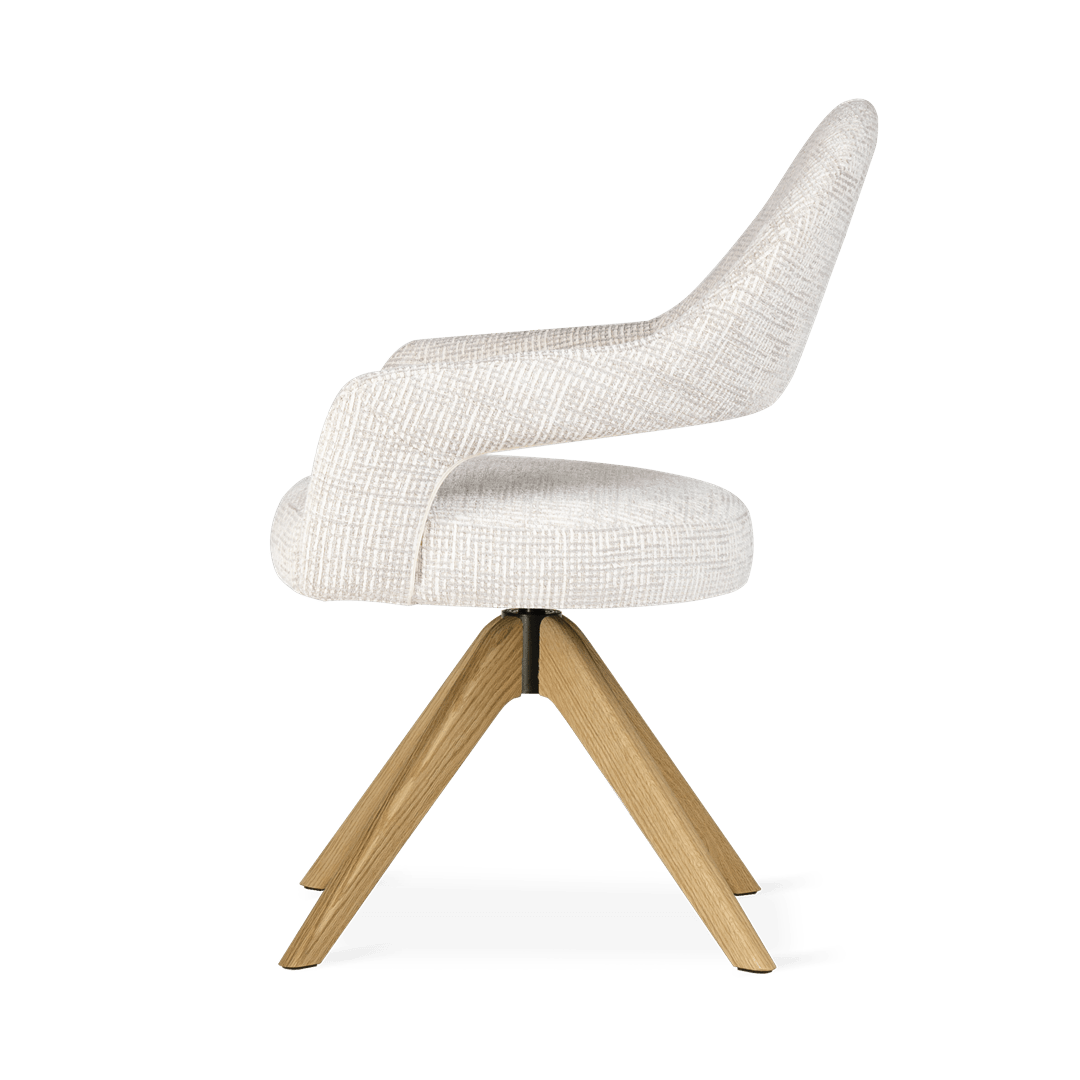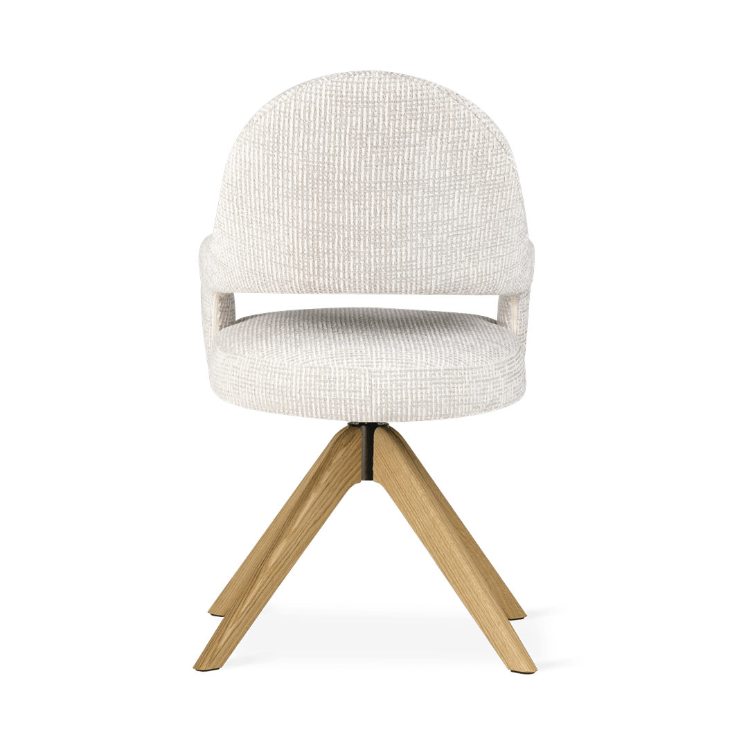 Ta izdelek lahko prilagodite svojim željam. Pregled materialov in barvZ oblikovanim naslonjalom in lesenim vrtljivim podnožjem jedilni stol Ivona zagotavlja ergonomsko udobje in svobodo gibanja. Eleganten izrez na naslonjalu in natančna dodelava dodajata značaj notranjosti, zahvaljujoč možnosti personalizacije pa lahko model popolnoma uskladite s svojim individualnim notranjim slogom in združite funkcionalnost z estetiko.
