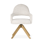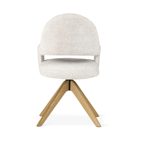 Z oblikovanim naslonjalom in lesenim vrtljivim podnožjem jedilni stol Ivona zagotavlja ergonomsko udobje in svobodo gibanja. Eleganten izrez na naslonjalu in natančna dodelava dodajata značaj notranjosti, zahvaljujoč možnosti personalizacije pa lahko model popolnoma uskladite s svojim individualnim notranjim slogom in združite funkcionalnost z estetiko.