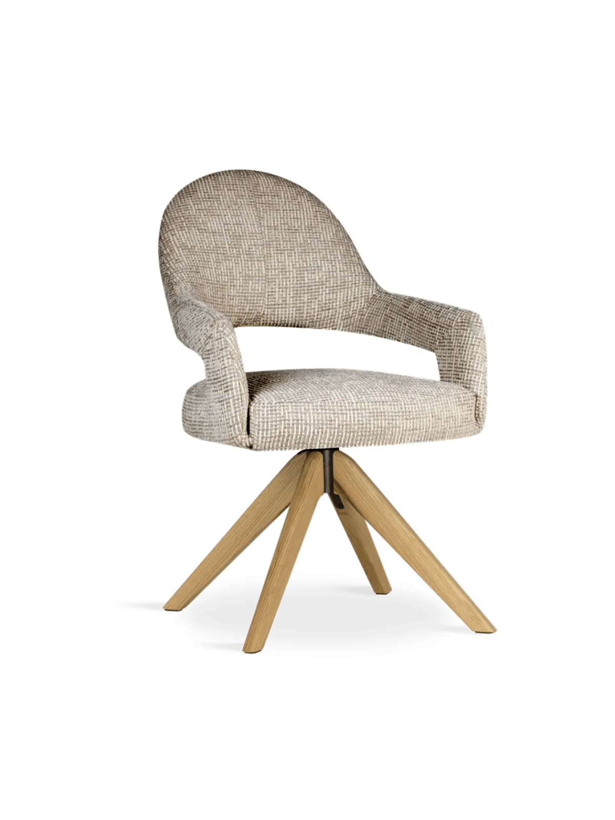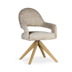 Ta izdelek lahko prilagodite svojim željam. Pregled materialov in barvZ oblikovanim naslonjalom in lesenim vrtljivim podnožjem jedilni stol Ivona zagotavlja ergonomsko udobje in svobodo gibanja. Eleganten izrez na naslonjalu in natančna dodelava dodajata značaj notranjosti, zahvaljujoč možnosti personalizacije pa lahko model popolnoma uskladite s svojim individualnim notranjim slogom in združite funkcionalnost z estetiko.