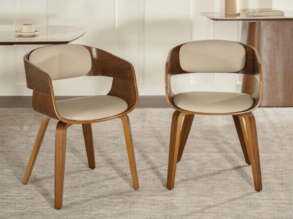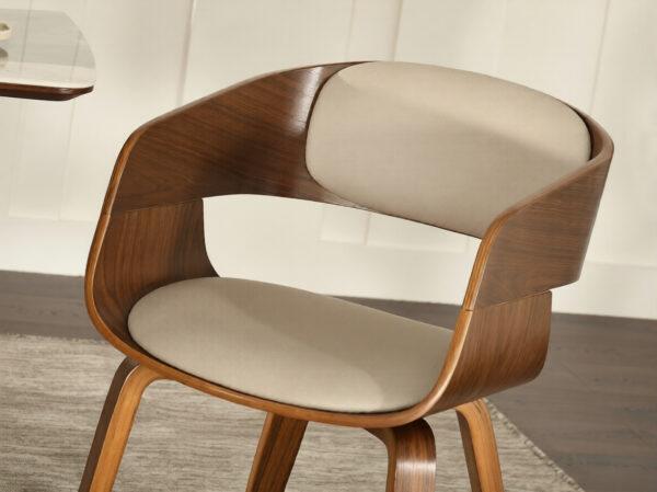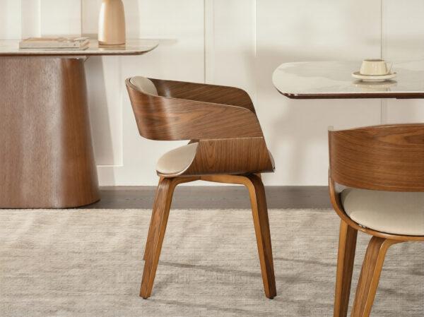 Jedilni stol Nola, izdelan iz visokokakovostnega upognjenega lesa, navdušuje s svojo vzdržljivostjo in organskimi konturami. Sedež in naslonjalo sta oblazinjena v eko usnje, ki ni le estetsko prijetno, ampak tudi enostavno za vzdrževanje.
