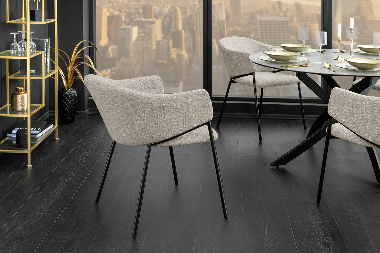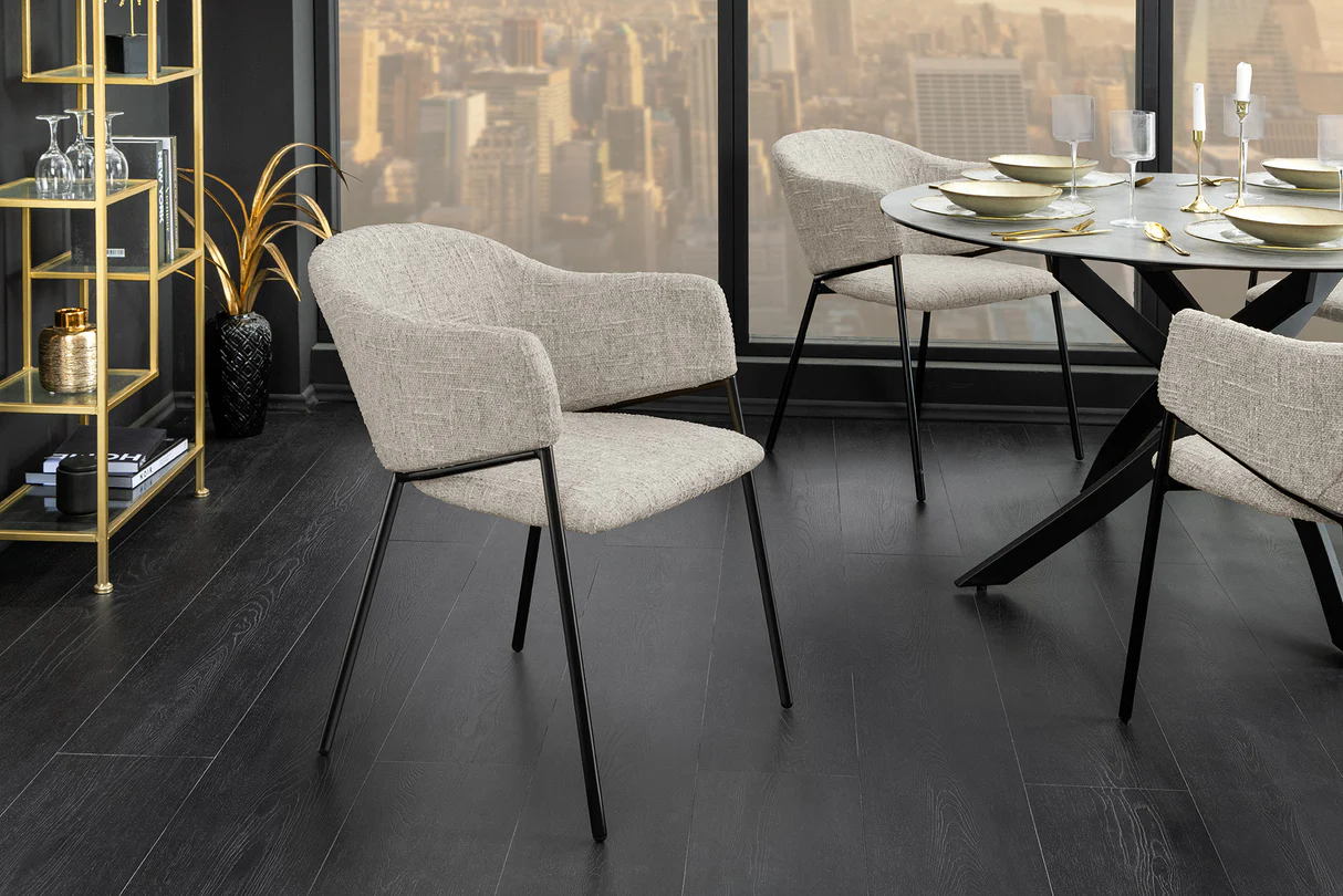 Jedilniški stol Panos s svojim trpežnim oblazinjenjem v vašo jedilnico vnese toplo in brezčasno eleganco. Teksturirana mehka površina vas vabi k sprostitvi in zagotavlja še posebej udobno sedenje. Ukrivljen hrbtni naslon z integriranimi nasloni za roke združuje eleganten videz z izjemnim udobjem sedenja.