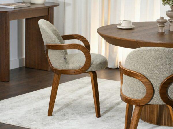 Jedilni stol Peyton izstopa ne le po svojem dizajnu, temveč tudi po ergonomski obliki, ki podpira pravilno držo in zagotavlja udobje tudi po dolgotrajni uporabi. Leseni nasloni za roke zagotavljajo dodatno oporo, trdna konstrukcija pa zagotavlja stabilnost in varnost.