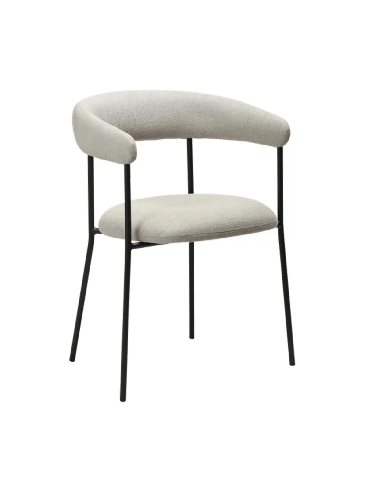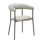 Naslonjalo tega stola je rahlo zaobljeno in se nadaljuje na naslonjala za roke. Naslonjalo in sedež sta prekrita z buklejem v barvi kašmirja in stojita na črnih kovinskih nogah.