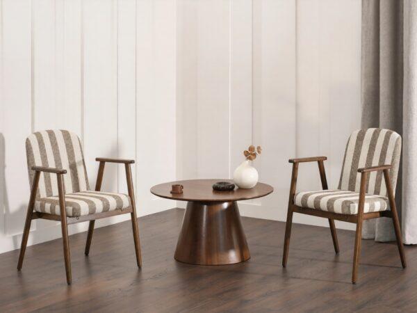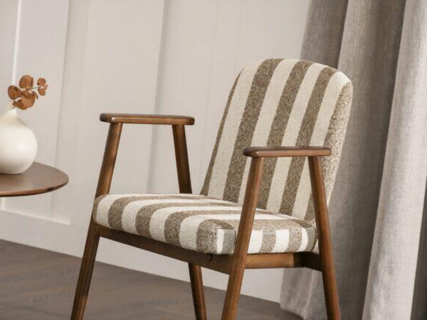 Jedilni stol Santorini je odlična izbira za ljubitelje sodobne in moderne notranjosti. Črtasto oblazinjenje mu daje lahkoten in eleganten občutek, leseno podnožje pa poudarja topel značaj modela. Popolnoma se poda k lesenim mizam in dodatkom v nevtralnih tonih ter ustvari prijetno vzdušje.