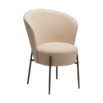 Miza je luksuznega videza z okroglim, mehkim sediščem in naslonjalom, oblečeno v bež reciklirano blago iz bukleja. Eleganten dizajn mize poudarjajo kovinske noge v barvi starinske medenine, ki dodajo pridih prefinjenosti in povzdignejo celotno zasnovo.
