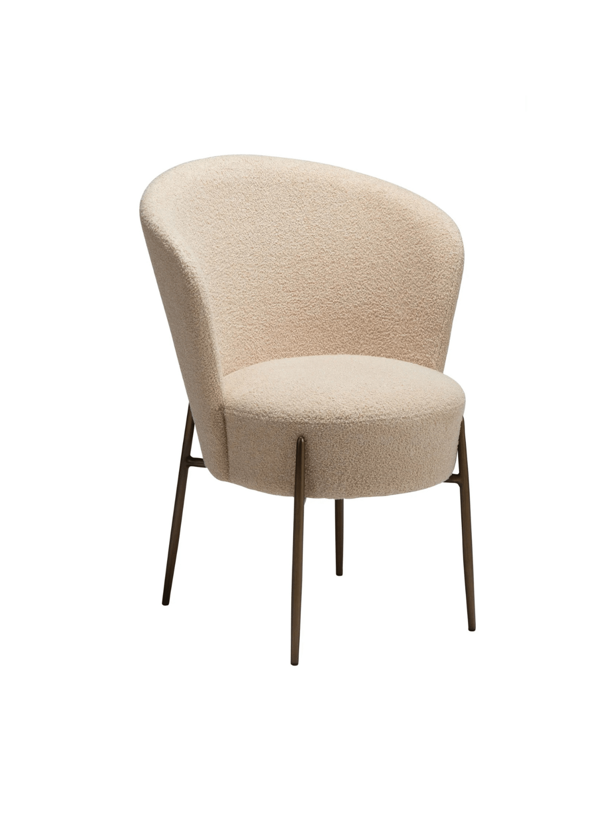 Miza je luksuznega videza z okroglim, mehkim sediščem in naslonjalom, oblečeno v bež reciklirano blago iz bukleja. Eleganten dizajn mize poudarjajo kovinske noge v barvi starinske medenine, ki dodajo pridih prefinjenosti in povzdignejo celotno zasnovo.