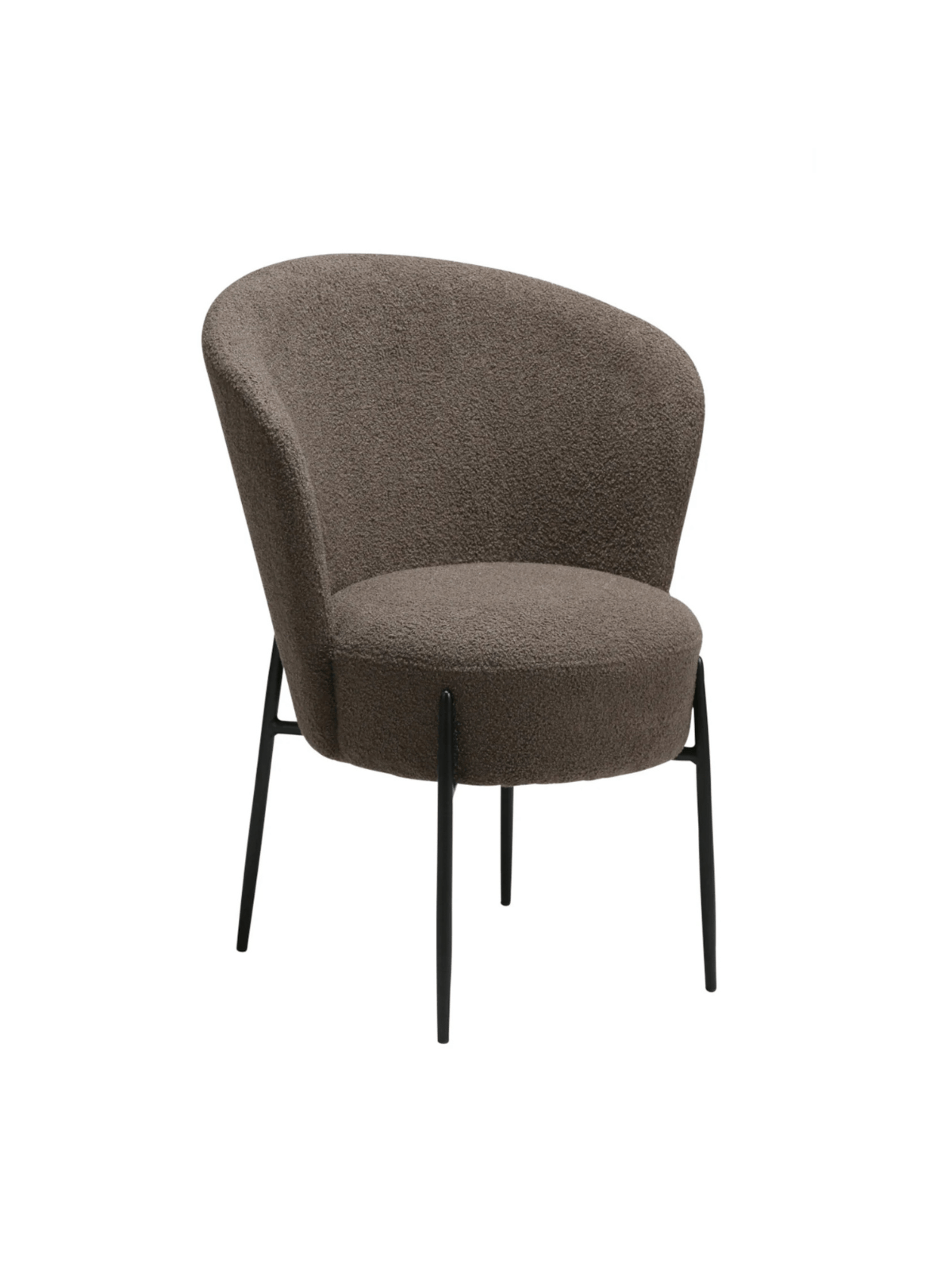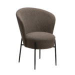 Stol ima razkošen videz z okroglim, mehkim sedežem in naslonjalom, oblečenim v rjavo reciklirano blago iz bukleja. Eleganten dizajn stola poudarjajo črne kovinske noge in dodajo pridih prefinjenosti ter povzdignejo celoten dizajn.