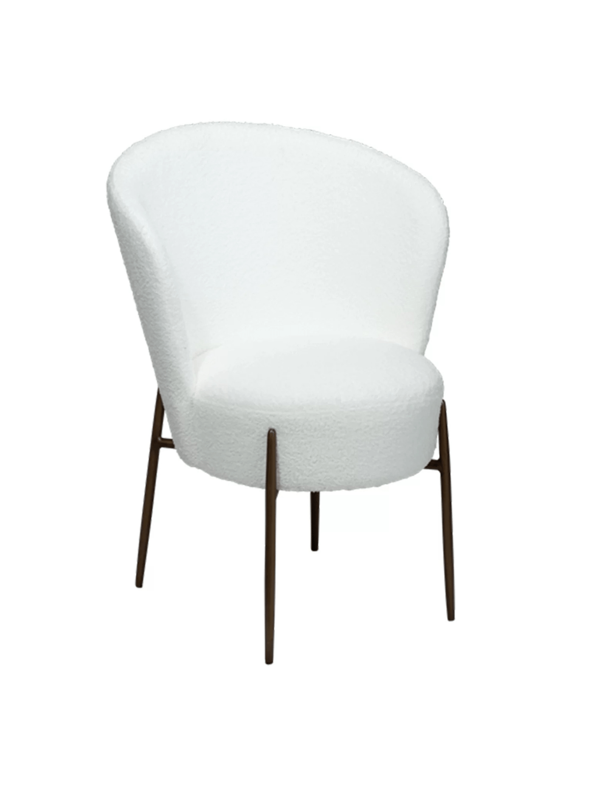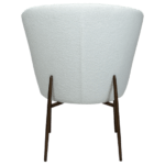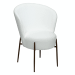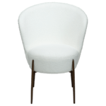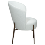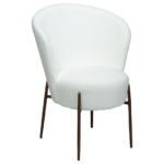 Stol je luksuznega videza z okroglim, mehkim sedežem in naslonjalom, oblečenim v snežno belo blago iz bukleja. Eleganten dizajn stola poudarijo kovinske noge v barvi starinske medenine in dodajo pridih prefinjenosti ter povzdignejo celoten dizajn.