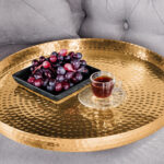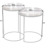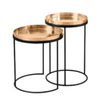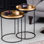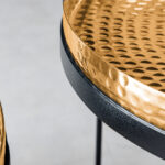 Večnamenski komplet klubskih mizic v zlati in srebrni različici se bo podal v interierje z orientalskimi elementi, pa tudi v vsak prostor, kjer potrebujete malo dodatnega sijaja. Aluminijaste mizne plošče so ročno izdelane v tehniki “zabijanje” in jih je mogoče odstraniti iz jeklene podlage ter uporabiti kot pladnje.