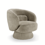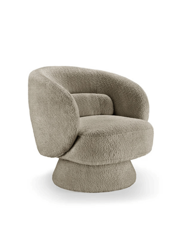 Vrtljivi fotelj retro oblike iz mehkega materiala bouclé (100% poliester) v taupe barvi z blazino za vse ljubitelje dizajna v pravem pomenu besede.