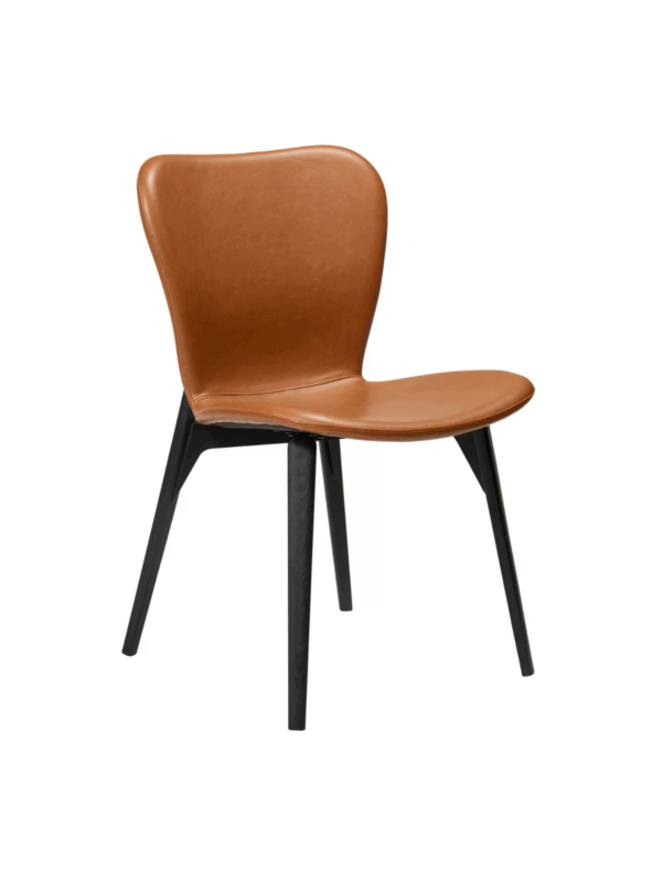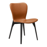 Ta stol izstopa po svojih elegantnih detajlih. Tanek, zaobljen sedež in naslonjalo sta oblečena v vintage svetlo rjavo umetno usnje in sta nameščena na nogah iz črnega jesenovega lesa z vidnimi vlakni.