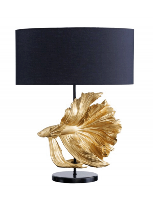 Osnova namizne svetilke Paul je školjka in je izdelana iz kovinsko-aluminijeve zlitine zlate barve, senčnik pa je iz črne tkanine.