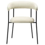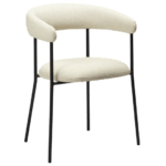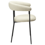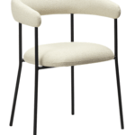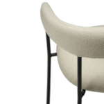 Naslonjalo tega stola je rahlo zaobljeno in se nadaljuje na naslonjala za roke. Naslonjalo in sedež sta prekrita z bež blagom iz bukleja in stojita na črnih kovinskih nogah.