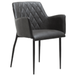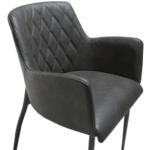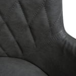 Ta stol združuje tradicionalni dizajn z modernim. Poudarjen je z diagonalnim šivom čez naslonjalo in ima udobne naslone za roke ter tanke črne kovinske noge. Prevlečena je z vintage sivim eko usnjem.