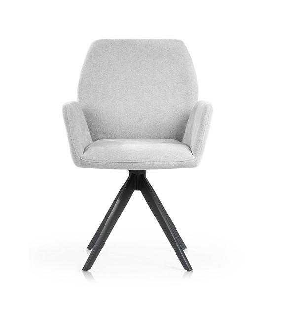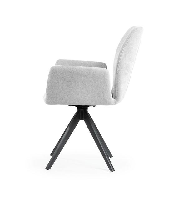 Udoben stol s črnimi, trdnimi kovinskimi nogami ima širok sedež, prekrit z udobnimi nasloni za roke, ki razbremenijo vaše roke med obroki ali delom. Vrtljiva noga poveča udobje uporabe in lahko razveseli tako mlajše kot starejše člane gospodinjstva.