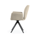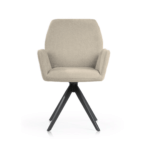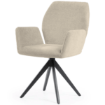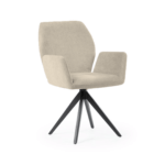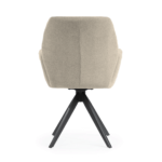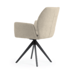 Udoben stol s črnimi, trdnimi kovinskimi nogami ima širok sedež, prekrit z udobnimi nasloni za roke, ki razbremenijo vaše roke med obroki ali delom. Vrtljiva noga poveča udobje uporabe in lahko razveseli tako mlajše kot starejše člane gospodinjstva.