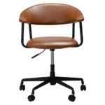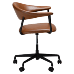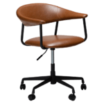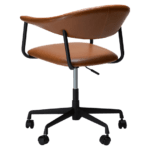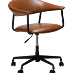 Pisarniški stol z naslonjalom, ki se raztegne v udobno nasloni za roke ima okrasne šive in udoben sedež. Prevlečena je z vintage svetlo rjavim eko usnjem. Podnožje tega stola je črne barve in ima 5 koles, ki omogočajo prosto gibanje po prostoru.