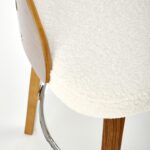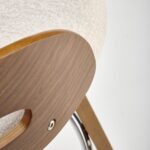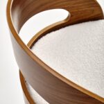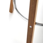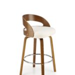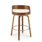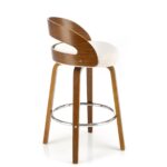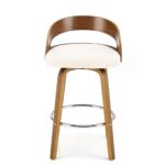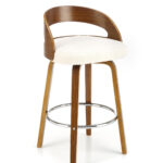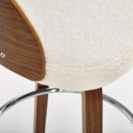 Polbarski stol z višino sedišča 66 cm, nogami in naslonjalom iz orehovega lesa, sediščem oblazinjenim z materialom bukle v krem odtenku in kromirano palico za noge je odličen za kuhinjske otoke in barske mize do višine 1 metra.