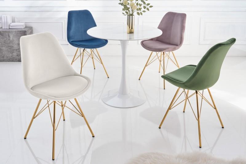 Stol je prefinjenega dizajna z žametnim oblazinjenjem v nežni temno zeleni barvi, medtem ko so noge izdelane iz kovine zlate barve. Elegantna kombinacija materialov in barv prispeva k udobju in stilu, visoko naslonjalo pa dodatno oporo pri sedenju.