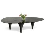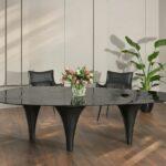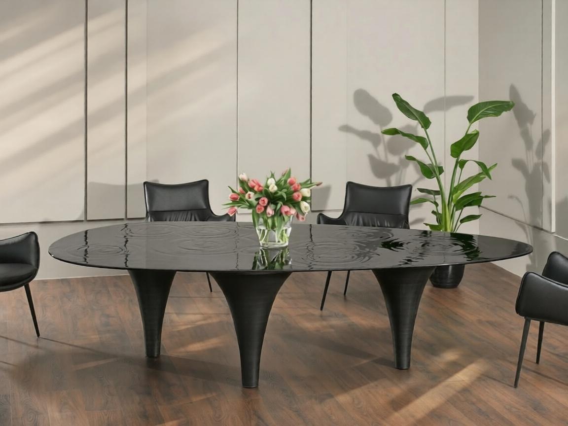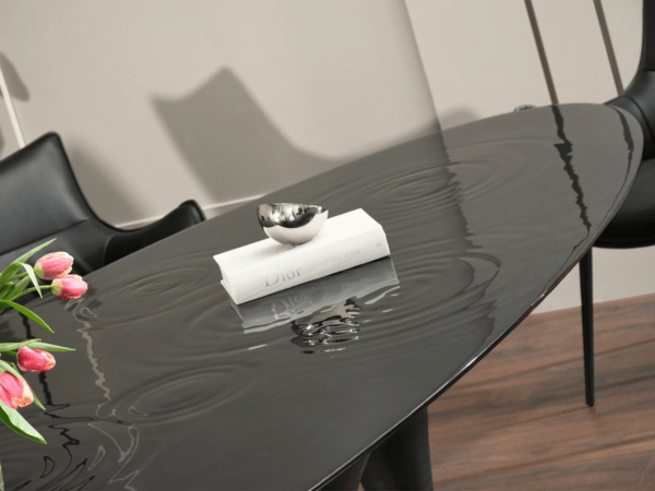 Steklena miza Piove izstopa predvsem zaradi edinstvenega vzorca koncentričnih krogov na antracitni plošči, kar daje modelu umetniški značaj. Svetlobo odbijajoča steklena plošča v kombinaciji z učinkom krožnega valovanja prikazuje dinamično interakcijo med gibanjem in mirovanjem v okolju. Zahvaljujoč nepravilni obliki plošče in trinožnemu podstavku miza zagotavlja stabilnost in udobje za do 12 oseb.
