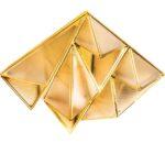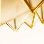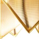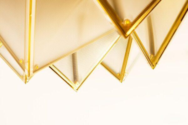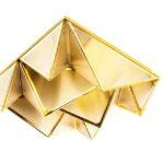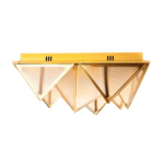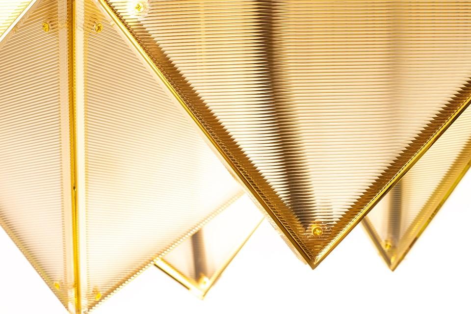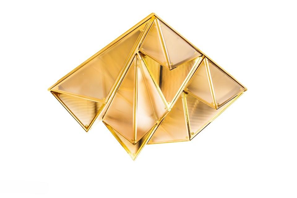 Kovinska struktura stropne svetilke Pyramids spominja na zapleteno zložen origami, v katerem trikotni moduli ustvarjajo presenetljivo tridimenzionalno kompozicijo. Zlata površina ji daje značilen dekorativni značaj, svetloba, ki prodira skozi akrilne površine, pa se nežno razprši in ustvarja prijetno vzdušje v prostoru.