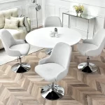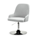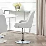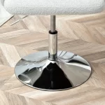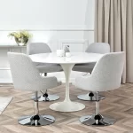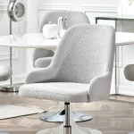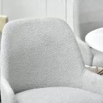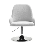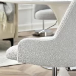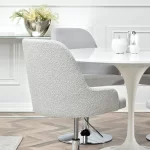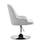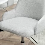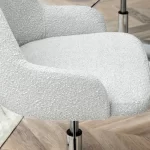 Vrtljivi stol Tadeo je postavljen na stojalo, ki ga je mogoče nastaviti – gor in dol. Nizki nasloni za roke prispevajo k udobju tega modela. Blago BOCULE, s katerim je prevlečen stol, je značilen vozlani material – vrsta polnega pletiva. Površina materiala je prekrita z gostimi in neenakomerno razporejenimi grčami, ima nizko stopnjo vpijanja tekočine in je trpežna. Jeklena osnova bo v kombinaciji z omenjeno tkanino dopolnila vsak interier.