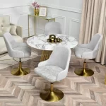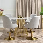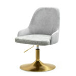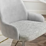 Vrtljivi stol Tadeo je postavljen na stojalo, ki ga je mogoče nastaviti – gor in dol. Nizki nasloni za roke prispevajo k udobju tega modela. Na voljo je v kombinaciji dveh različnih tekstur blaga. Sedež je oblečen v blago Enjoy me. Ta rahlo hrapav, a prijeten na dotik material odlikuje vzdržljivost: je odporen proti ognju in otrokom prijazen. Odlikuje ga tudi odpornost proti obrabi. Druga, tkanina Chill me velur, ima hidrofobni premaz, ki otežuje vpijanje tekočin. Primeren tudi za otroke in hišne ljubljenčke ter odporen proti ognju. Naslonjalo za hrbet in roke tega modela sta pokrita z njim.