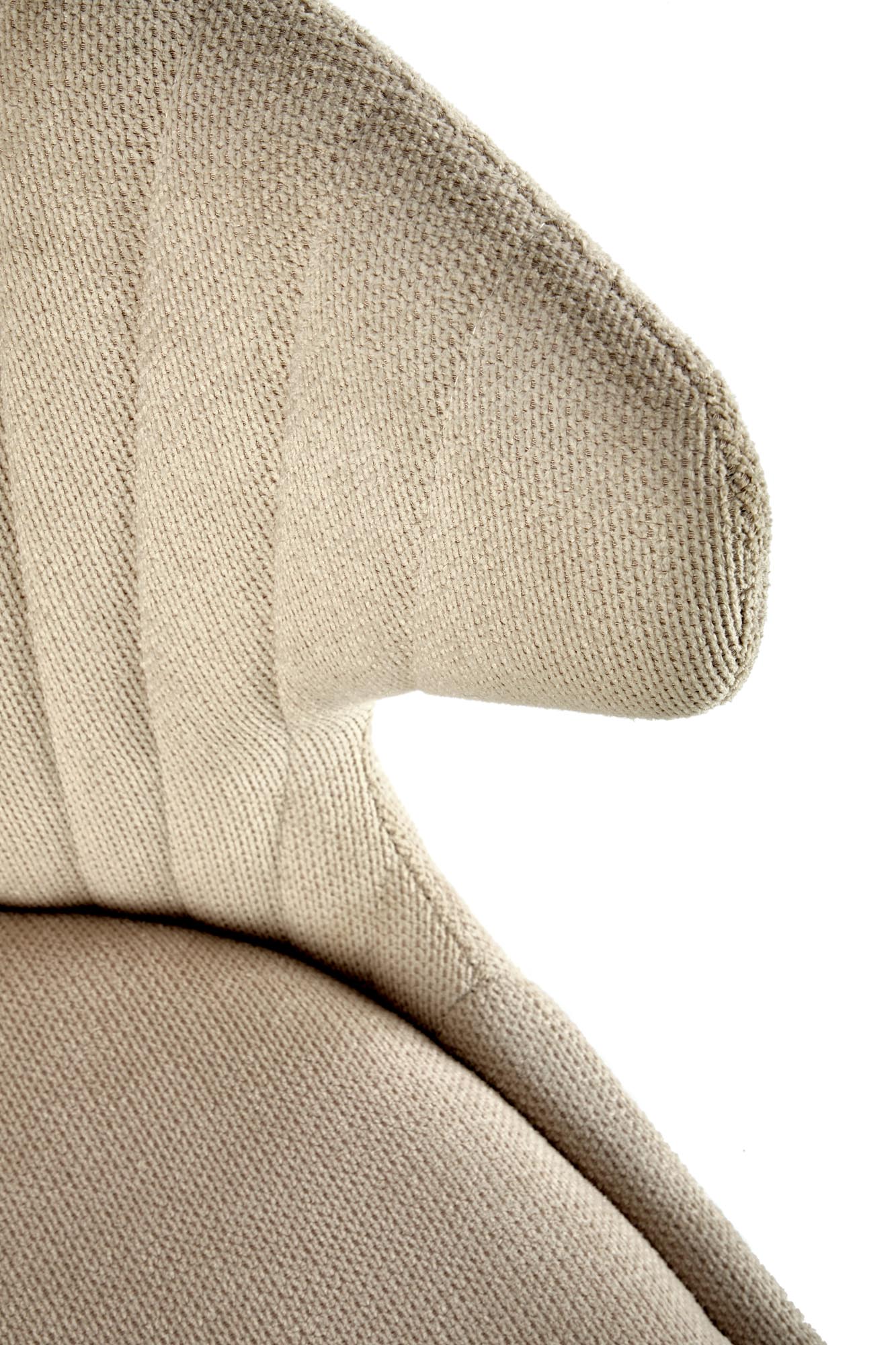 Stol, oblazinjen v grobo tkano tkanino, z naslonjalom nenavadnega dizajna in kovinskimi nogami je na voljo v treh odtenkih: bež, sivi in oker.