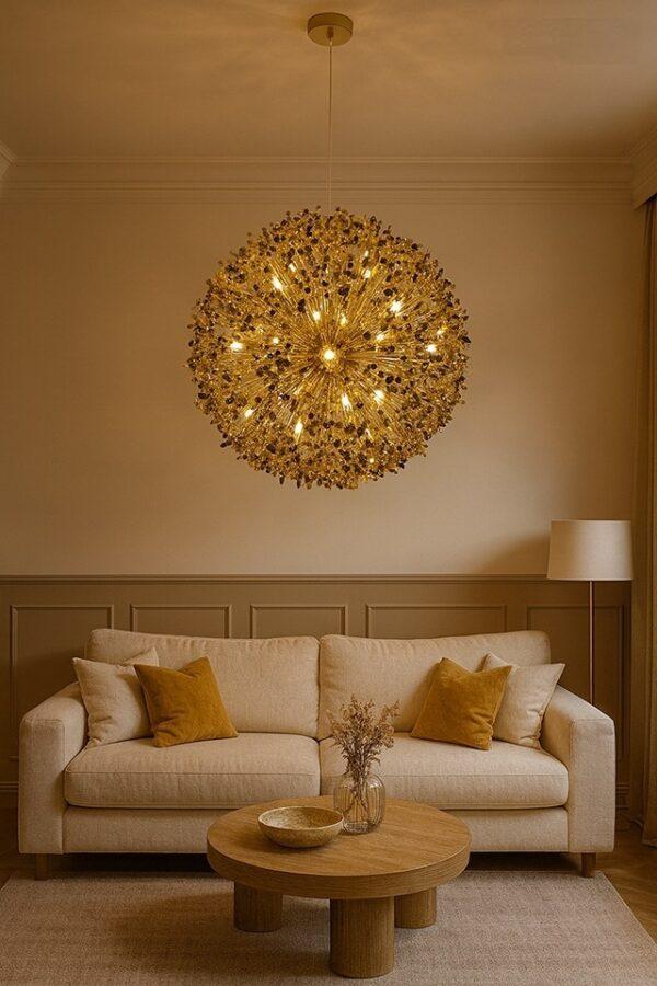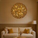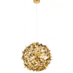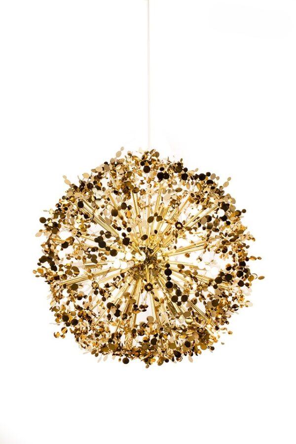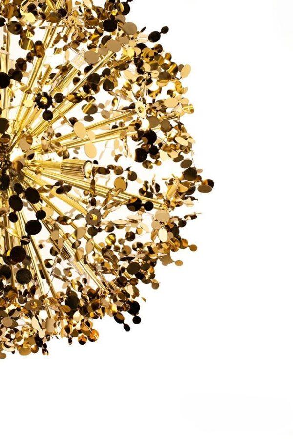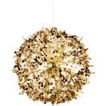 Viseča svetilka Monete je estetsko privlačna svetilka, ki pritegne pozornost in spodbuja ustvarjalnost. Struktura svetilke je izdelana iz kovine v sijoči zlati barvi. Edinstven senčnik spominja na pest kovancev, ki visijo s prozornega kabla in okrogle stropne plošče. Svetilke iz kolekcije Monete bodo odličen dodatek nad jedilno mizo ali ekstravaganten element dnevne sobe.