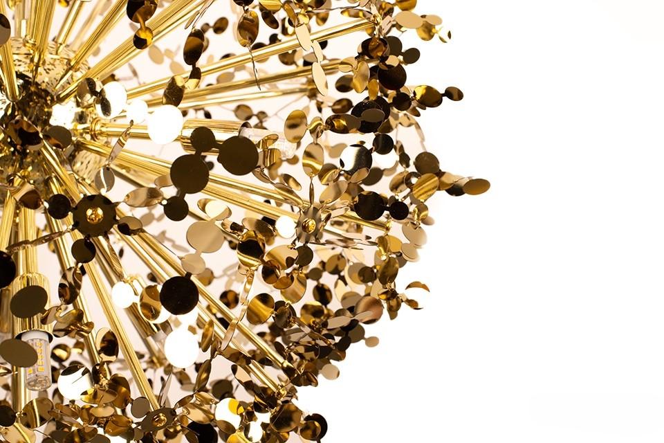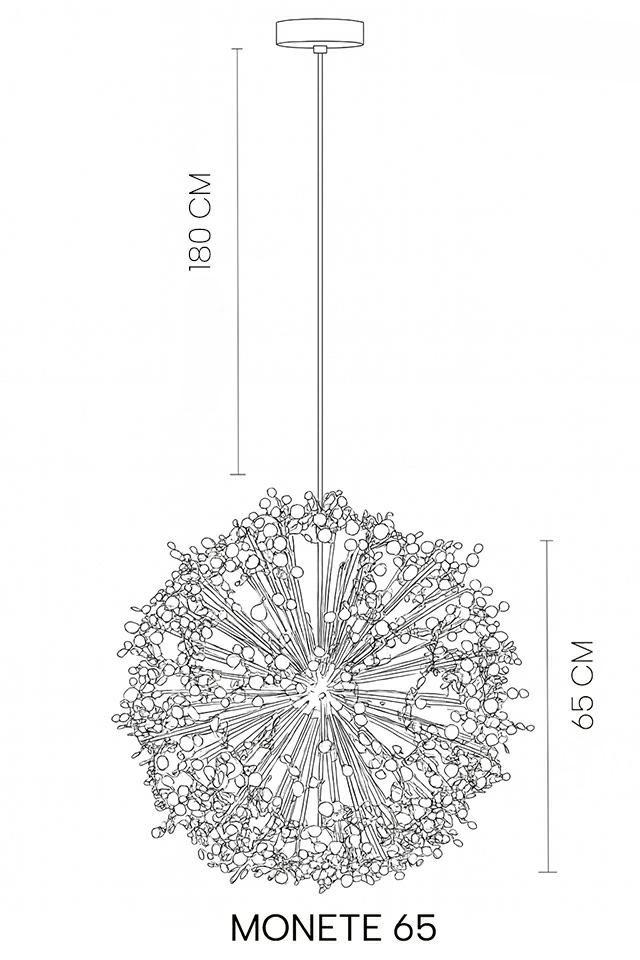 Viseča svetilka Monete je estetsko privlačna svetilka, ki pritegne pozornost in spodbuja ustvarjalnost. Struktura svetilke je izdelana iz kovine v sijoči zlati barvi. Edinstven senčnik spominja na pest kovancev, ki visijo s prozornega kabla in okrogle stropne plošče. Svetilke iz kolekcije Monete bodo odličen dodatek nad jedilno mizo ali ekstravaganten element dnevne sobe.