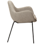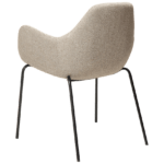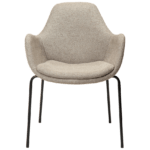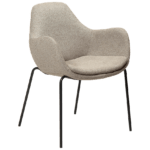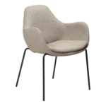 Ta stol je moderen in udoben, s prostornim sedežem in ozkim naslonjalom, oblečenim v temno rjavo blago iz bukleja. Osnova tega fotelja je sestavljena iz črnih kovinskih nog.