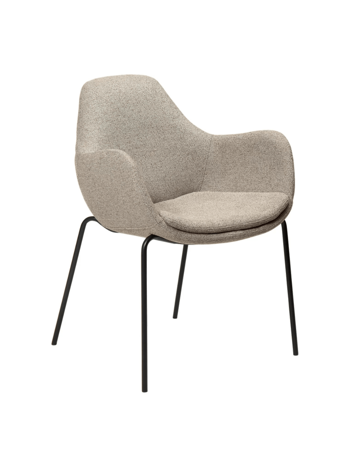 Ta stol je moderen in udoben, s prostornim sedežem in ozkim naslonjalom, oblečenim v temno rjavo blago iz bukleja. Osnova tega fotelja je sestavljena iz črnih kovinskih nog.